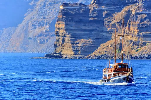 The island's main towns, Fira and Oia, are perched on the cliffs and offer